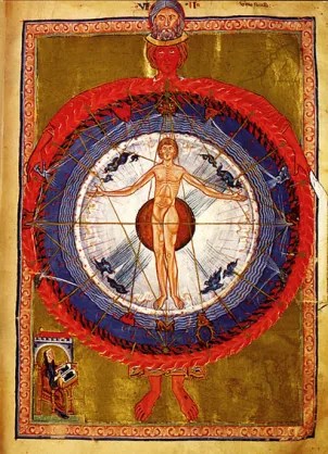 In this Imagination, we are tapping into a vision of the Cosmic Human Being — made in God’s Image, Male and Female, as recounted in Genesis. This understanding can be found in the writings of the Essenes, and also in Syrian-Palestinian baptizing movements of Jesus’ time. The Son of Man is primordial Man — Man from the time before the Fall; even more radically (i.e., at root), Man in the eye-heart of God before the beginning of Time. (For some Hebrew/Jewish Kabbalists, this Man came to be known as Adam Kadmon.) This understanding of Cosmic Man (Cosmic Adam) remained within the Church as late as the High Middle Ages — as seen in this thirteenth-century manuscript from Rhineland Germany below.