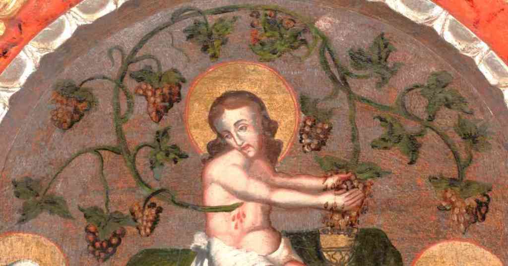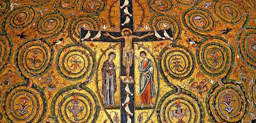 From the eighth century CE onward, True Vine imagery for Christ was conflated with that of the All-Embracing World Tree (the Redeeming Cross). For the sake of Eucharistic catechesis, this conflation process began early in the history of the Church: in 385 CE, Bishop Ambrose of Milan (339-397 CE) indicated that, if one were to secure the link between Christ’s sacrifice on the Cross with the ongoing sacrifice performed in the Eucharist under the appearance of wine, it would be helpful to imagine Christ on the cross as a vine growing on a trellis.